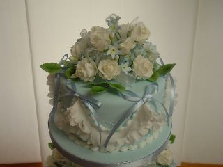 白いバラが映えるように土台のケーキは水色に決め、サイドデコレーションは白いフリルをあしらって、