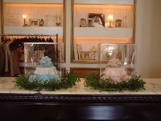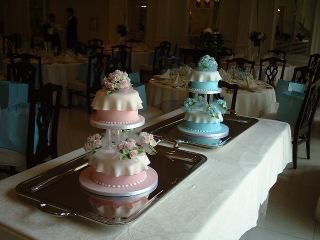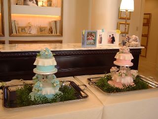 ピンクのケーキが、新婦側、ブルーのケーキが新郎側ということで、仲良く一緒にケーキ入刀されたとのこと。