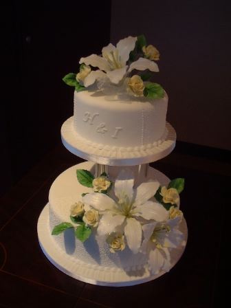白いユリをあしらった2段の真っ白なウエディングケーキです。